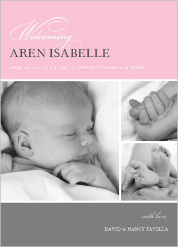 This is the card I used or our birth announcements. The pink and gray is what I feel in love with. So is the different fonts that are used. You can go here to find this all the choices for announcements.